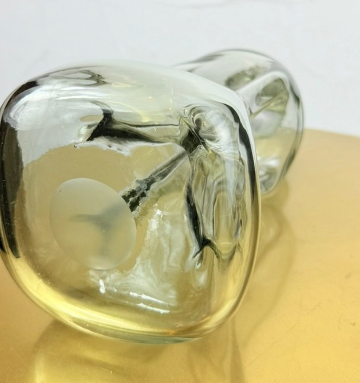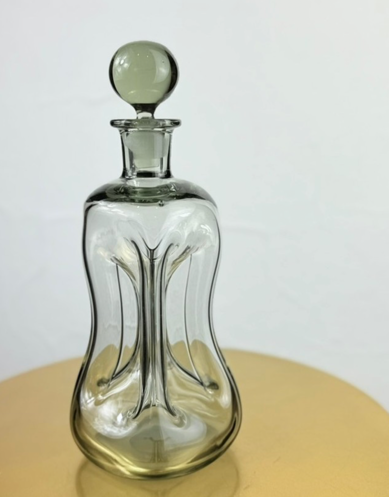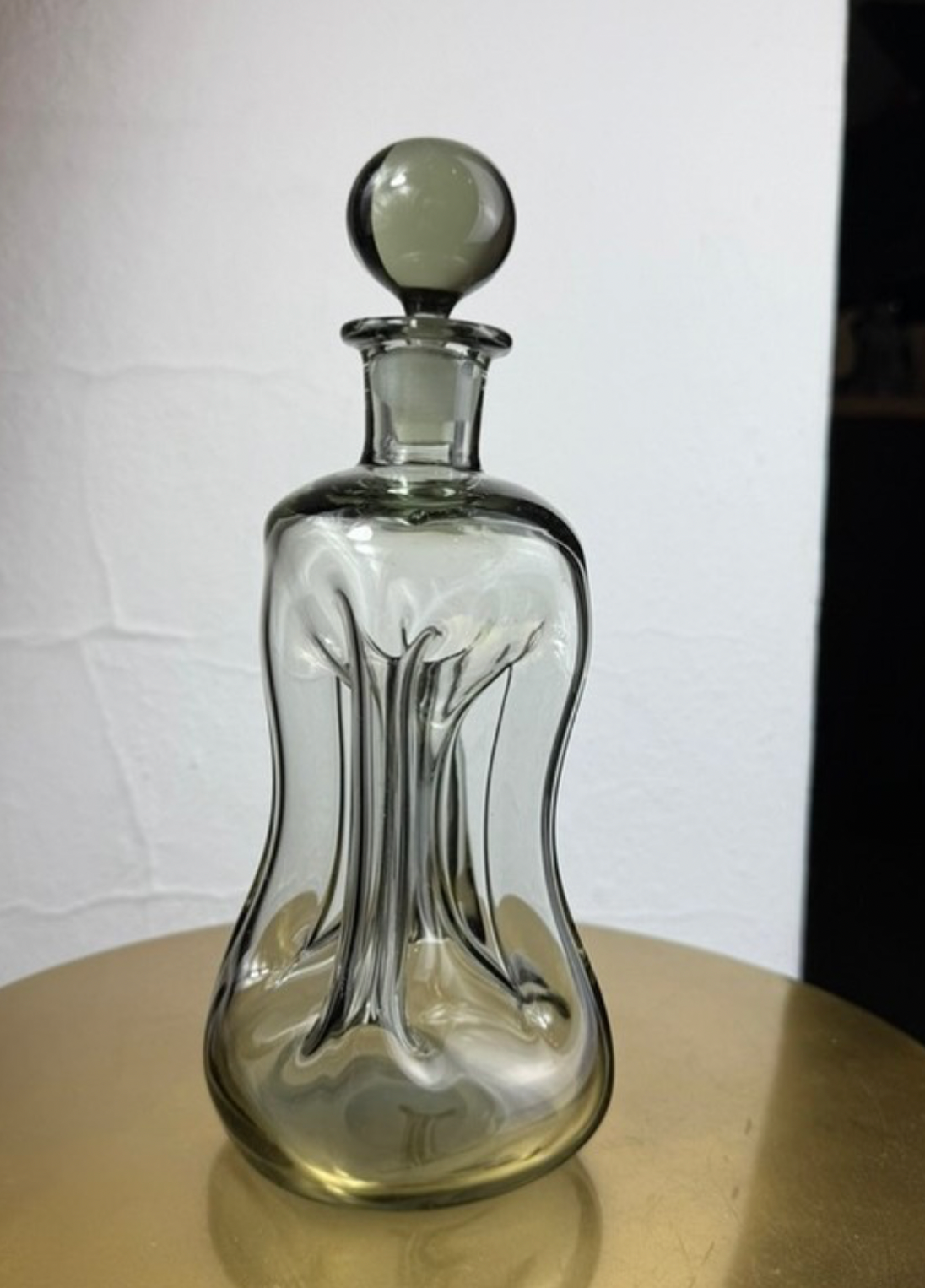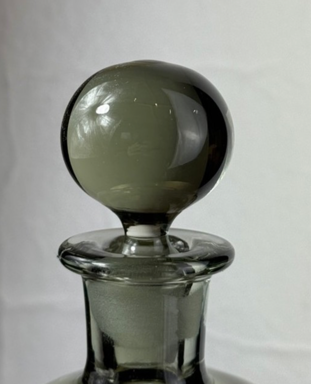 Karafka jest w doskonałym stanie z oryginalnym korkiem. Dymnoszary kolor wysokiej jakości szkła ma wspaniały i użyteczny wzór. Karafka z dmuchanego szkła wykonana ręcznie.